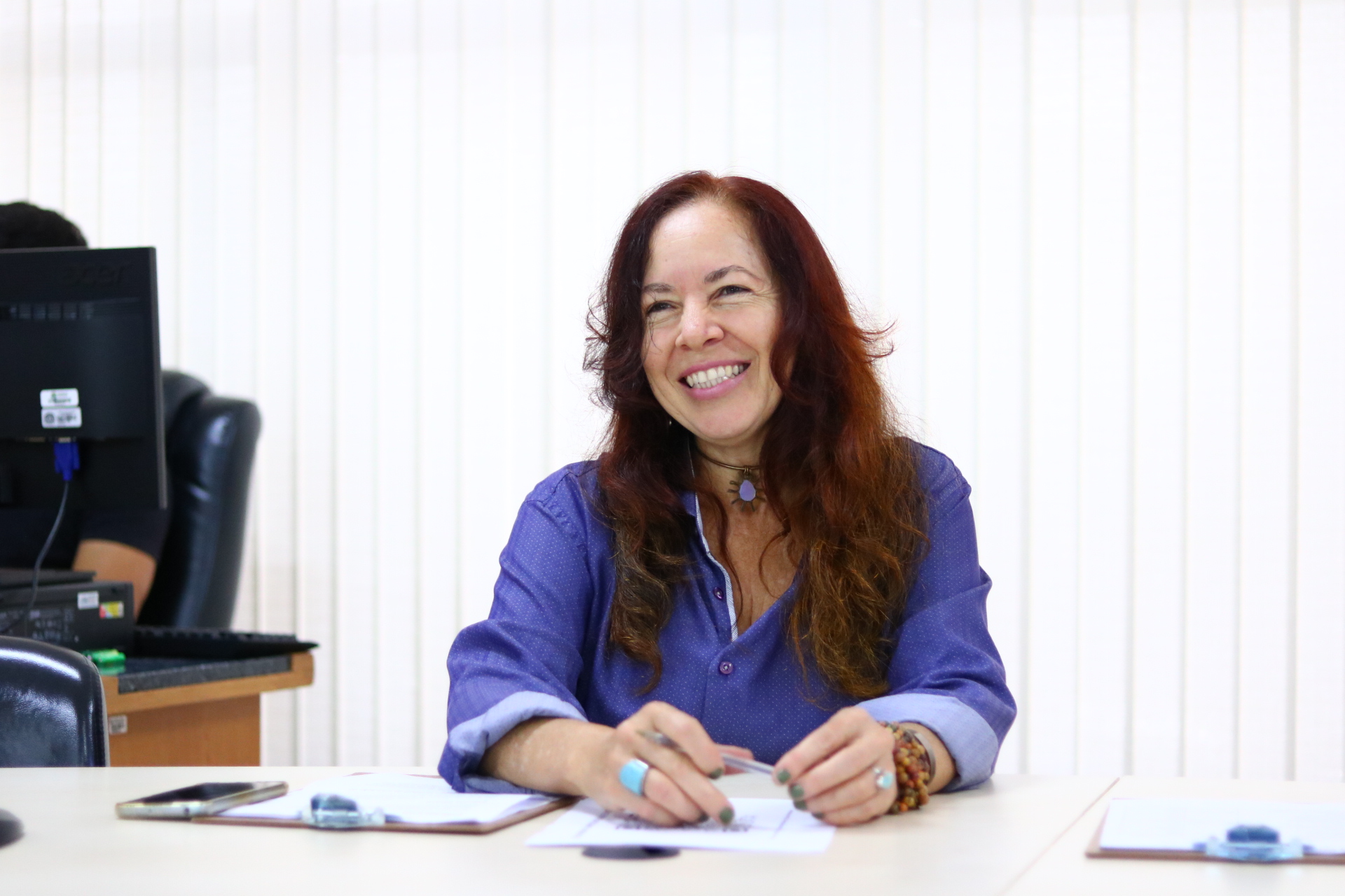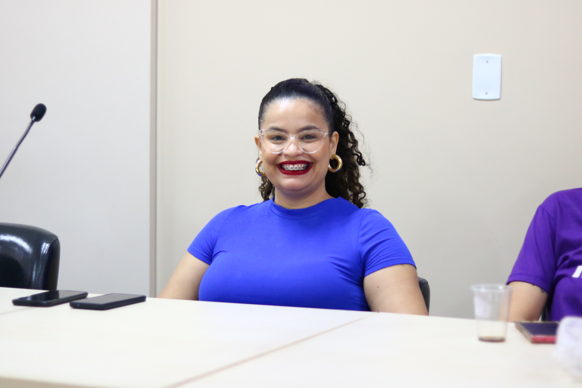 Servidora da Escola Legislativa sorri sentada à mesa durante evento Juntas Somos Mais Fortes na Câmara Municipal de Goiânia