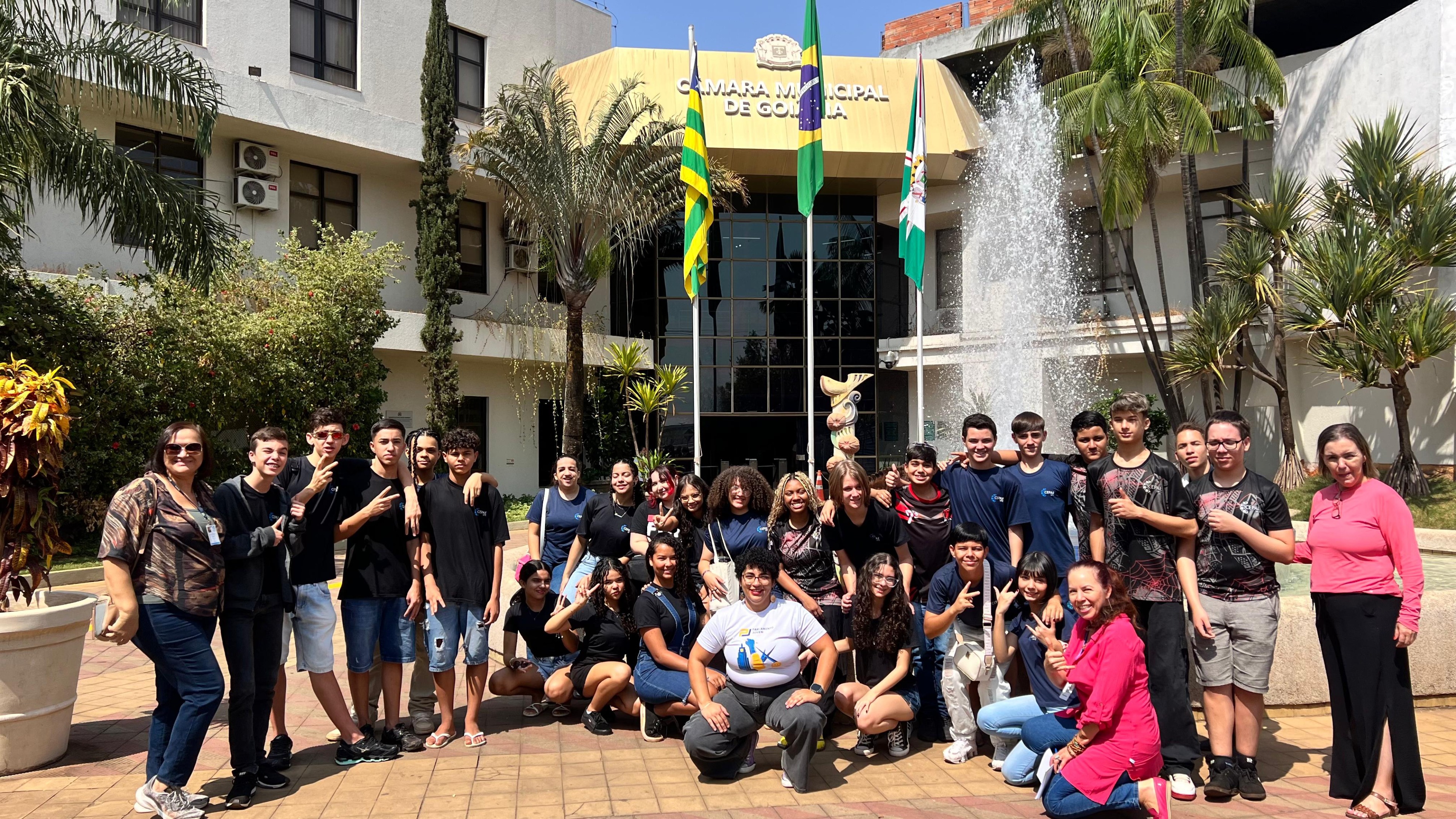 Turma de visita guiada em frente à fonte