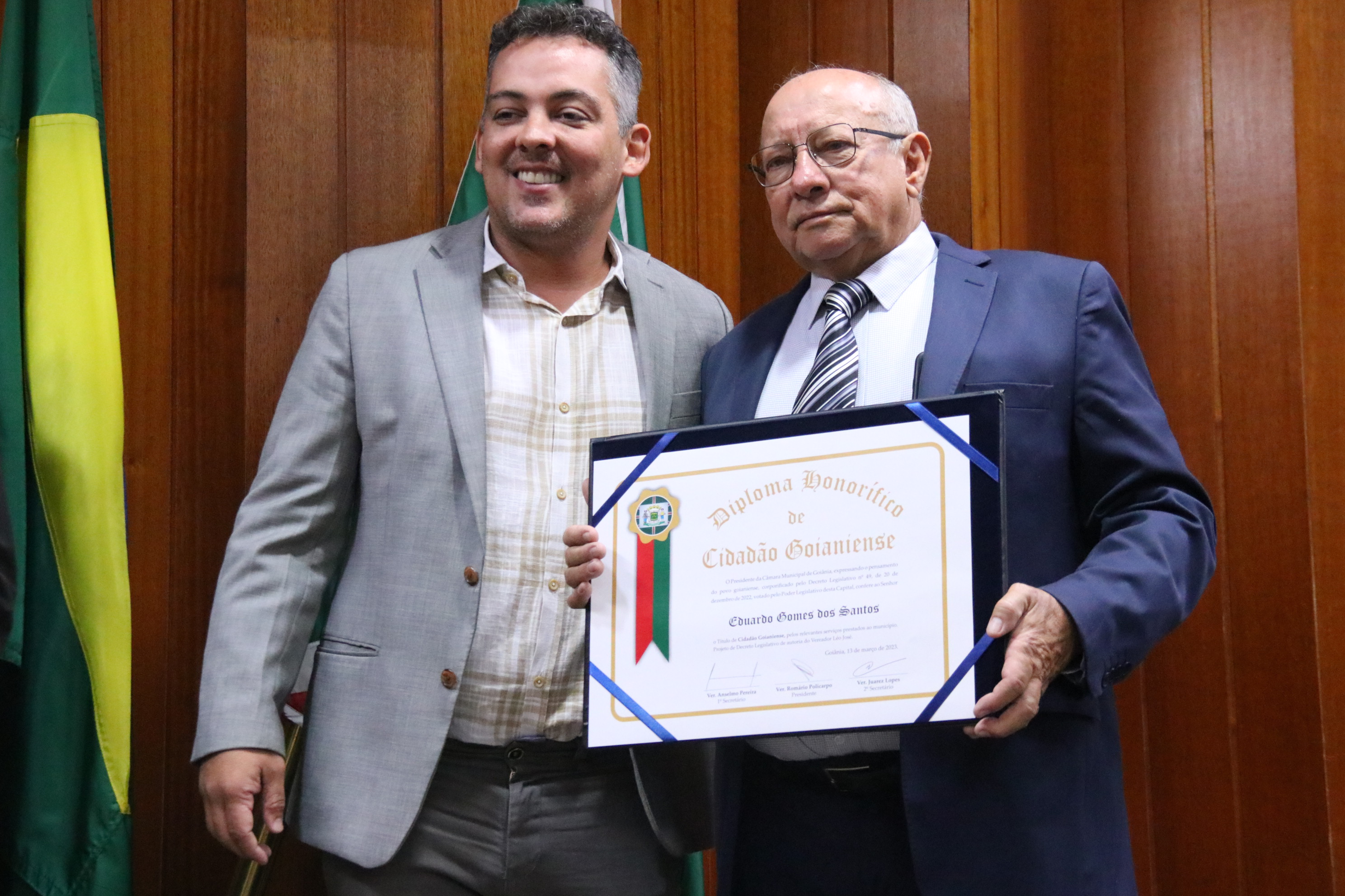 13/3/2023 - Sessão Solene: Entrega de Título de Cidadania Goianiense (Péricles de Castro e Silva; Eduardo Gomes dos Santos)