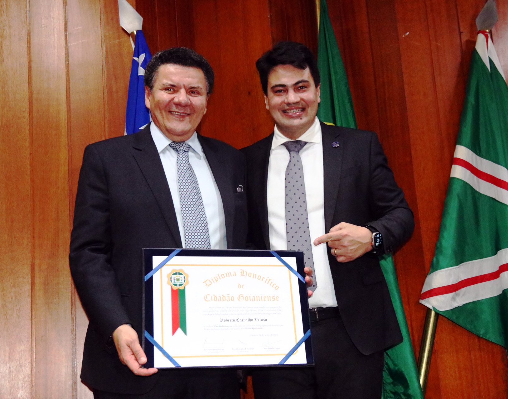 04/06/2024 - Entrega de Título de Cidadania Goianiense (Desembargadores Luis Gustavo Soares Amorim de Sousa e Roberto Carvalho Veloso)