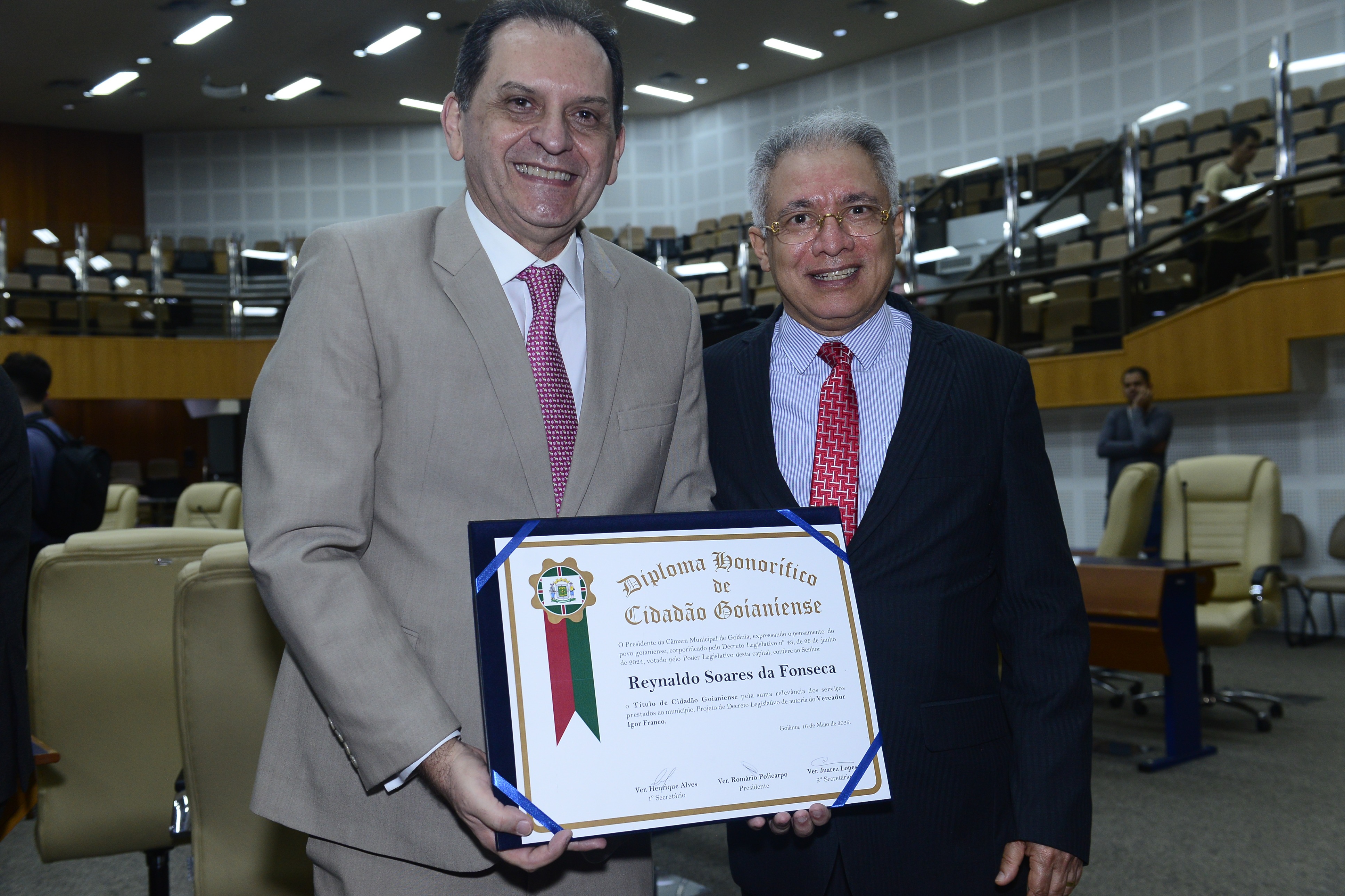 16/5/2025 - Sessão Solene: Outorga de Títulos de Cidadania Goianiense: Sra. Maria das Graças Soares Amorim; Srs. João Batista Moreira e Reynaldo Soares da Fonseca
