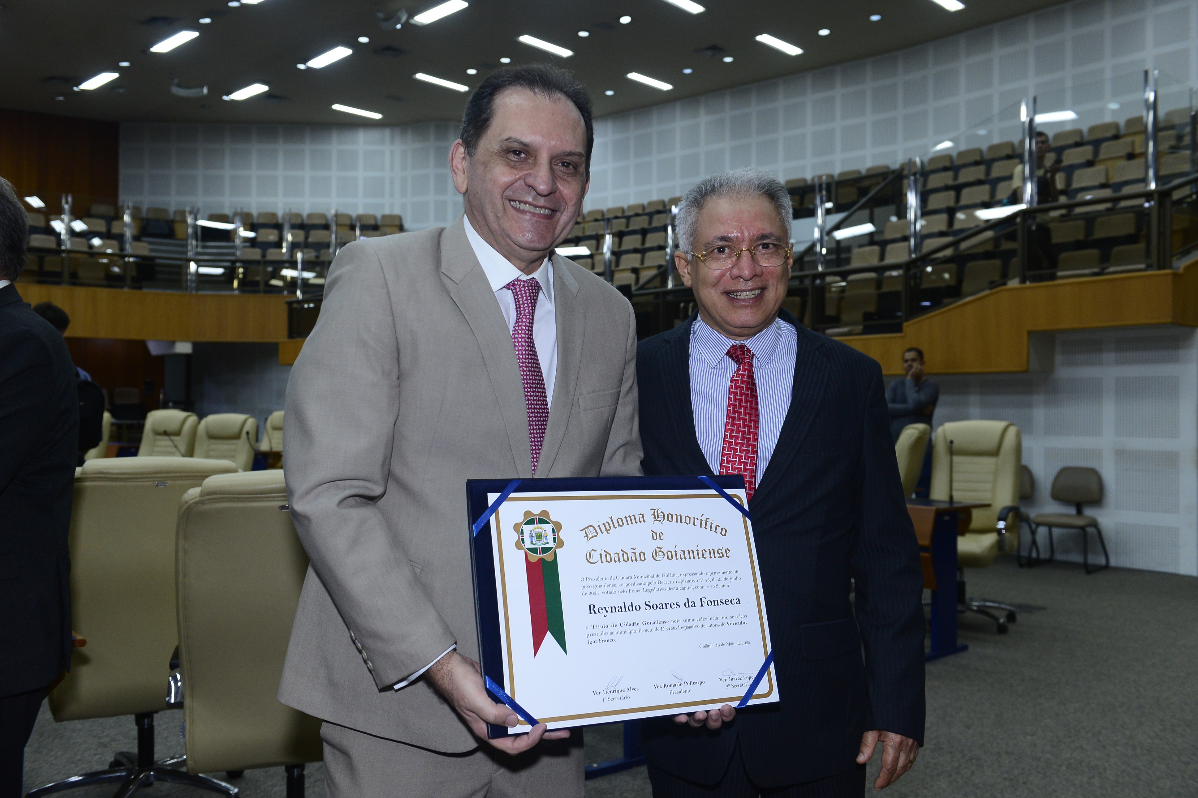 16/5/2025 - Sessão Solene: Outorga de Títulos de Cidadania Goianiense: Sra. Maria das Graças Soares Amorim; Srs. João Batista Moreira e Reynaldo Soares da Fonseca