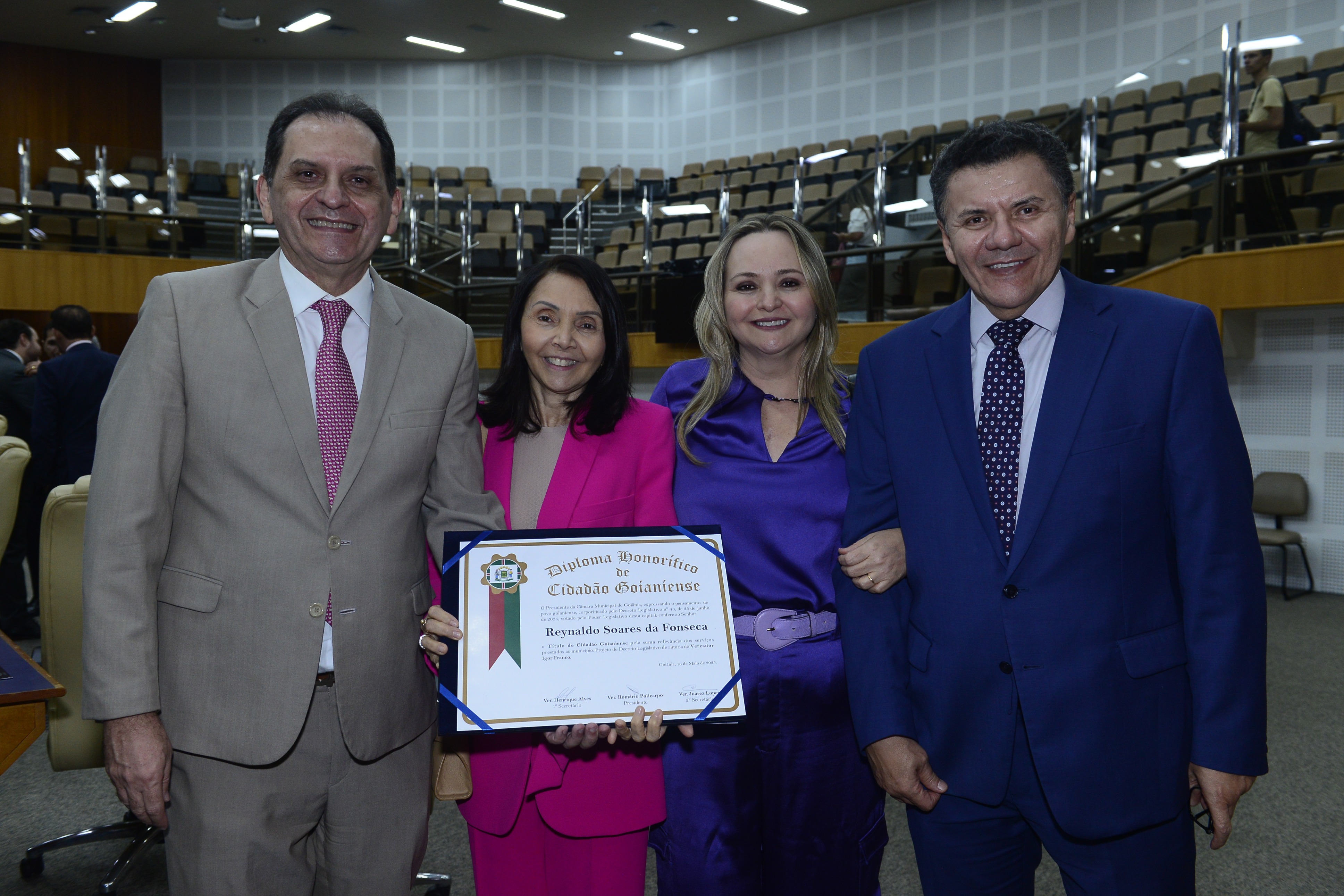 16/5/2025 - Sessão Solene: Outorga de Títulos de Cidadania Goianiense: Sra. Maria das Graças Soares Amorim; Srs. João Batista Moreira e Reynaldo Soares da Fonseca