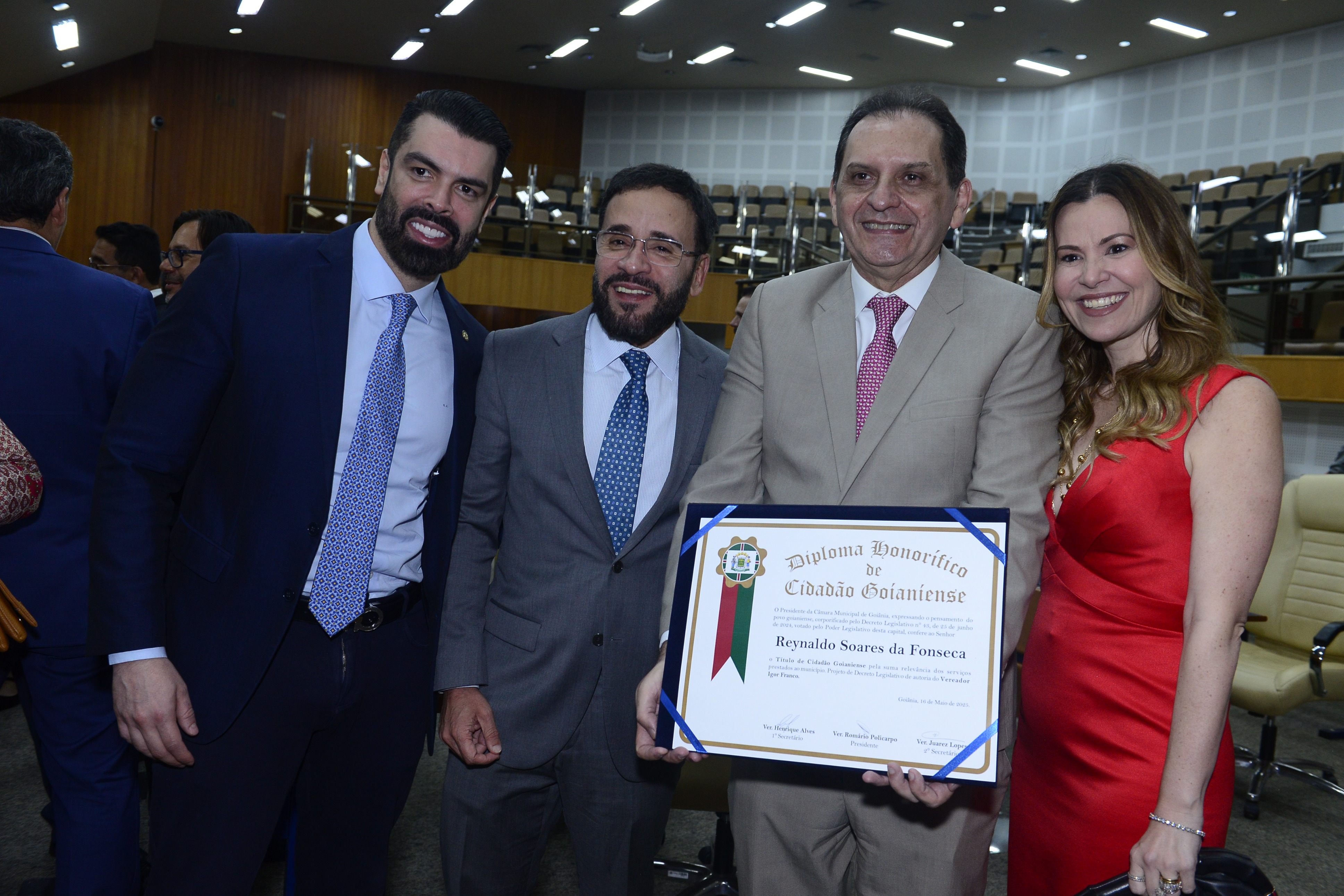 16/5/2025 - Sessão Solene: Outorga de Títulos de Cidadania Goianiense: Sra. Maria das Graças Soares Amorim; Srs. João Batista Moreira e Reynaldo Soares da Fonseca