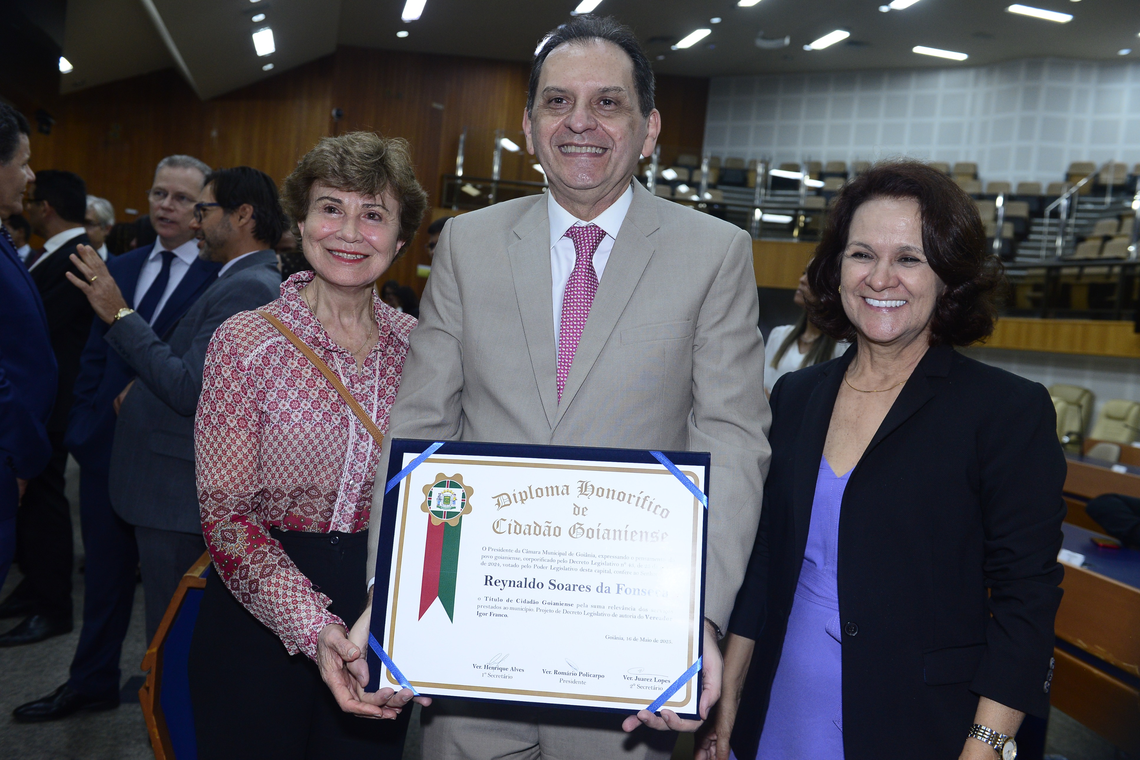 16/5/2025 - Sessão Solene: Outorga de Títulos de Cidadania Goianiense: Sra. Maria das Graças Soares Amorim; Srs. João Batista Moreira e Reynaldo Soares da Fonseca