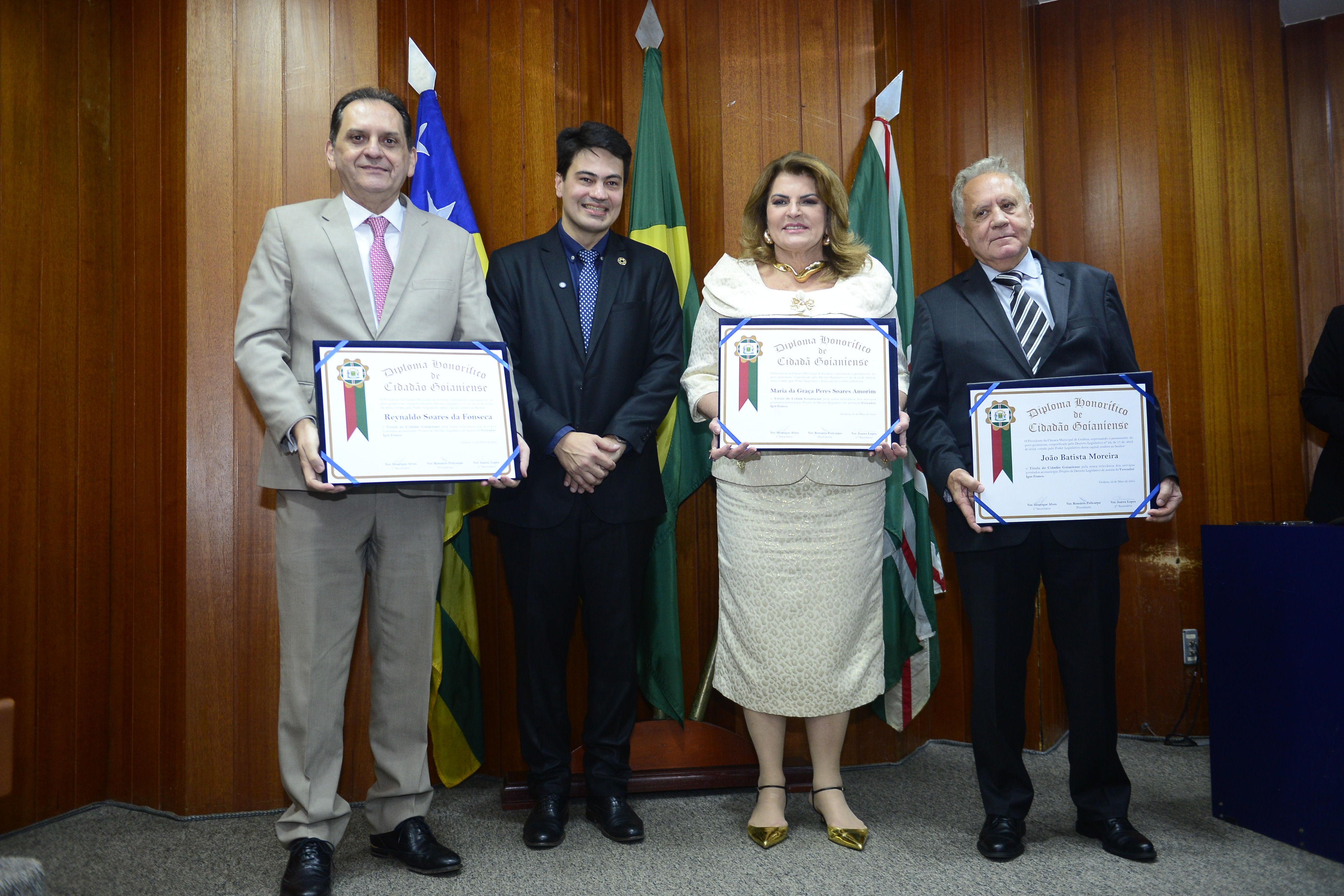 16/5/2025 - Sessão Solene: Outorga de Títulos de Cidadania Goianiense: Sra. Maria das Graças Soares Amorim; Srs. João Batista Moreira e Reynaldo Soares da Fonseca