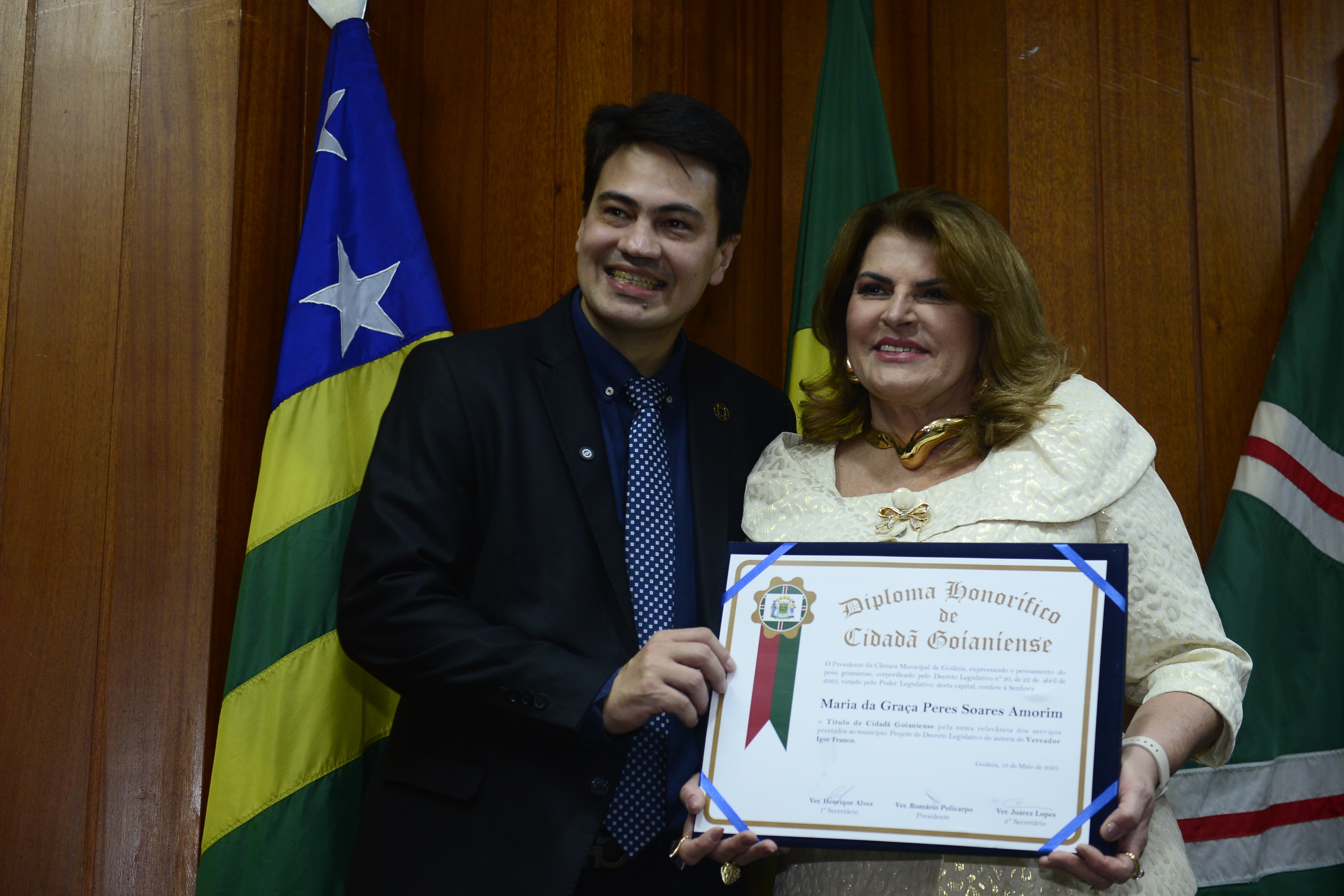 16/5/2025 - Sessão Solene: Outorga de Títulos de Cidadania Goianiense: Sra. Maria das Graças Soares Amorim; Srs. João Batista Moreira e Reynaldo Soares da Fonseca