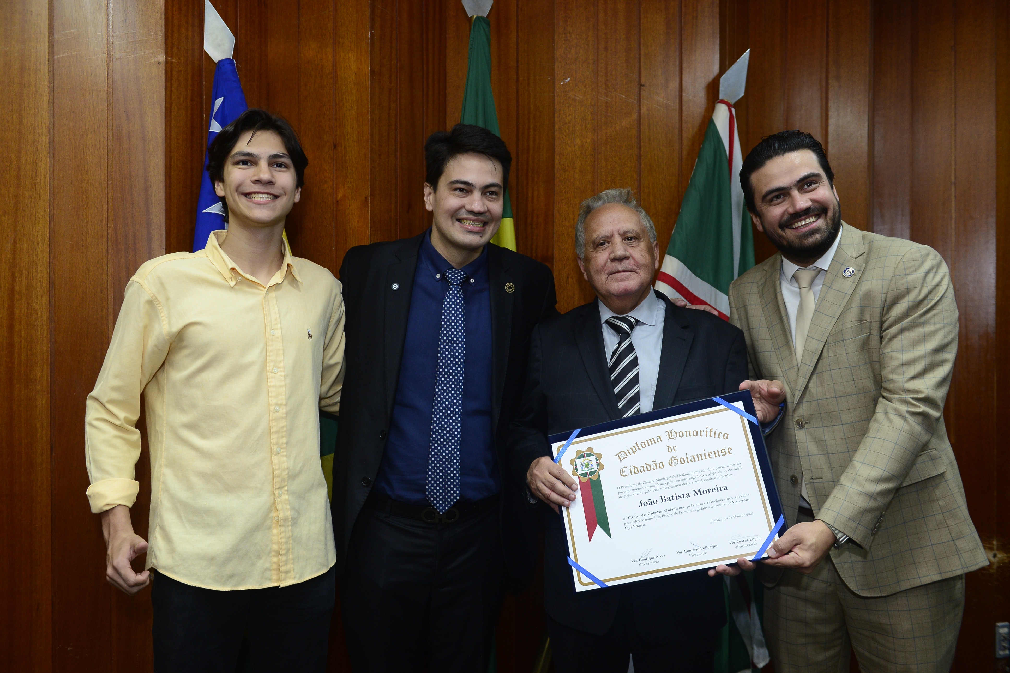 16/5/2025 - Sessão Solene: Outorga de Títulos de Cidadania Goianiense: Sra. Maria das Graças Soares Amorim; Srs. João Batista Moreira e Reynaldo Soares da Fonseca