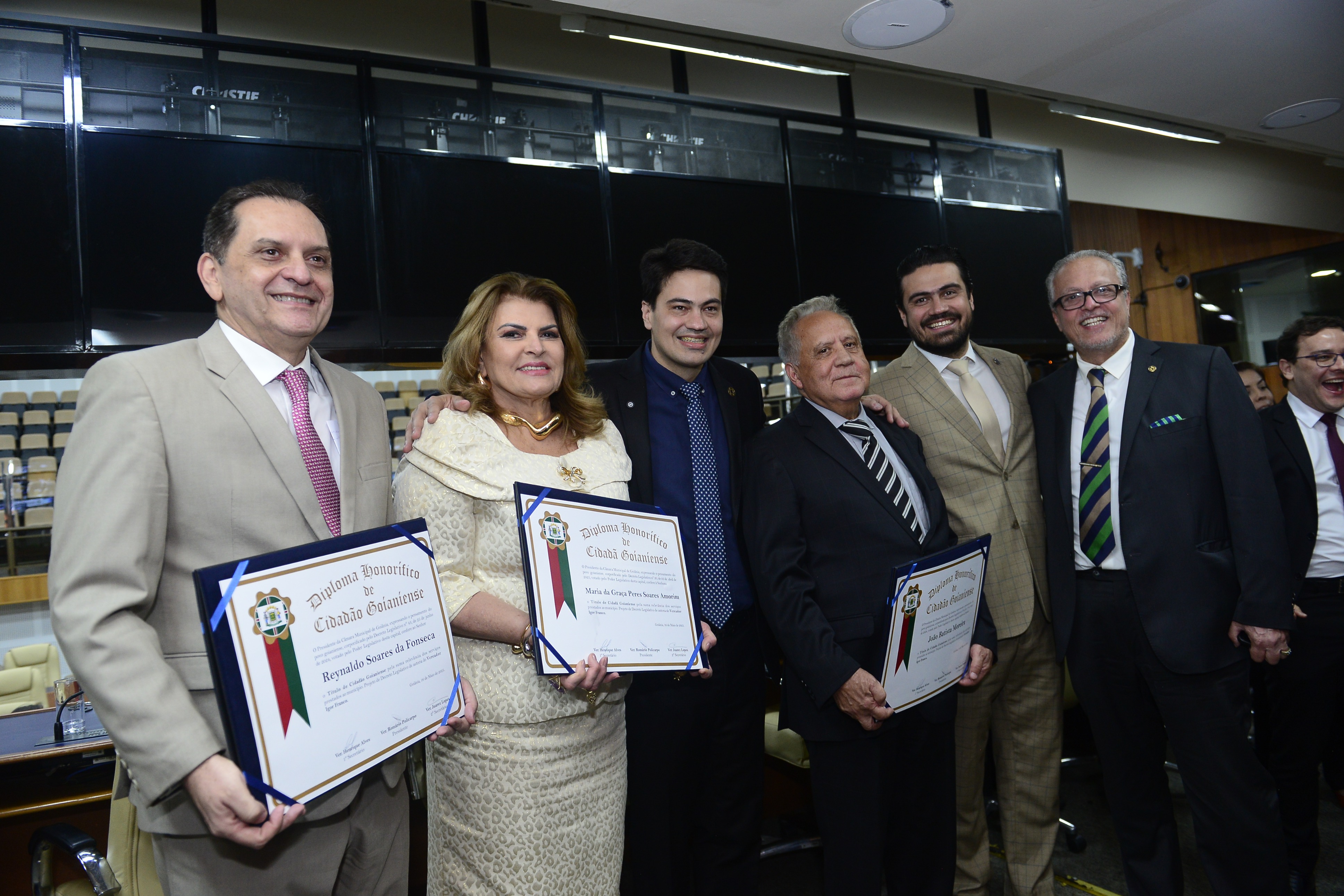 16/5/2025 - Sessão Solene: Outorga de Títulos de Cidadania Goianiense: Sra. Maria das Graças Soares Amorim; Srs. João Batista Moreira e Reynaldo Soares da Fonseca